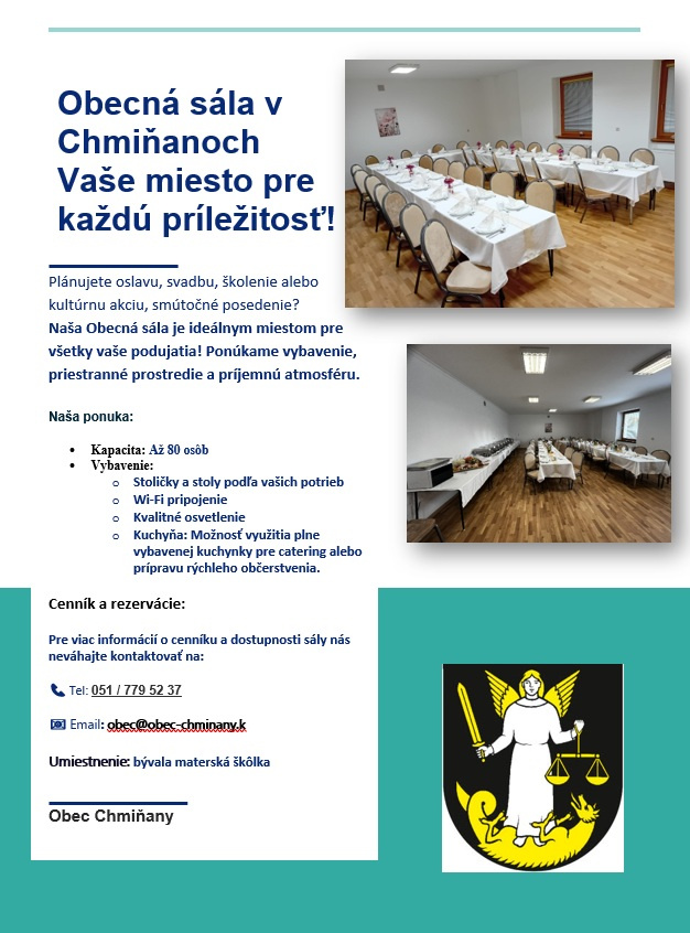 Cenník a rezervácie: Pre viac informácií o cenníku a dostupnosti sály nás neváhajte kontaktovať na: ???? Tel: 051 / 779 52 37 ???? Email: obec@obec-chminany.k |